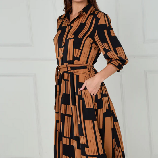 Make a bold yet refined statement with our Black and Tan Geometric Stripe Print Midi Shirt Dress, a standout piece that combines modern design with timeless elegance. Crafted from a soft, flowing fabric, it features a striking geometric stripe print in rich tan tones against a sleek black background. The button-through front, classic shirt collar, and self-tie belt define the waist for a flattering silhouette, while the long sleeves with roll-up button tabs add versatile styling options. Finished with handy side pockets and a graceful midi-length hem, this dress effortlessly transitions from workdays to weekends—style it with heels for a polished look or ankle boots for contemporary everyday chic.