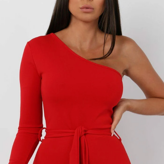 Less really is more when it comes to the Monali Red Belted One Shoulder Jumpsuit. With a plain fabric, and relaxed figure hugging fit, this hot jumpsuit is an easy must have this AW18. With a one shoulder design and belted waist to really help those curves pop, this hot jumpsuit is so in demand this season. Being complete with a straight leg fit, this hot one piece is ideal for any events this autumn. Team up with your perspex heels and metallic accessories to complete the look.